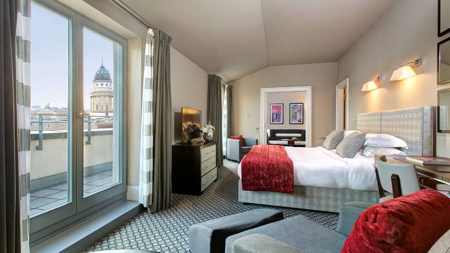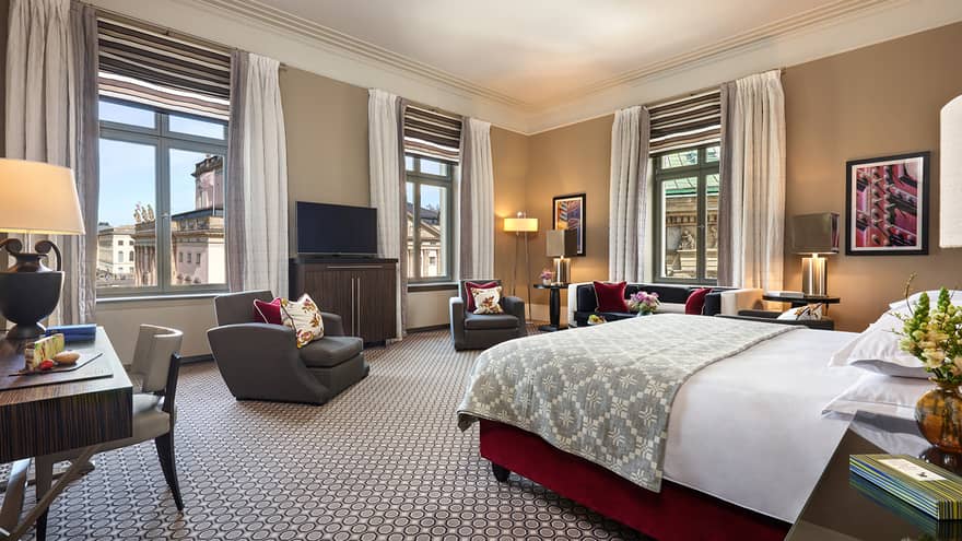 45-55 sqm | 1 King Bed or 2 Twin Beds | Sleeps 3With high ceilings and abundant light, this expansive living space is furnished with a king bed, wide desk and stylish living area. Large windows overlook historic Bebelplatz.